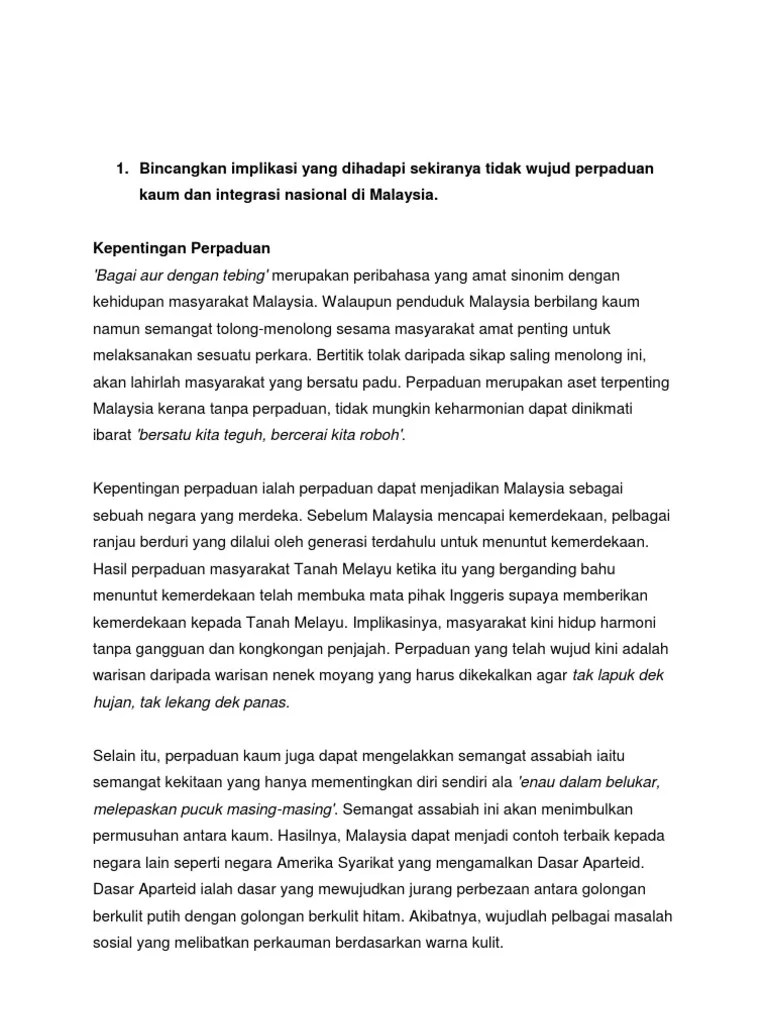 Contoh karangan perpaduan kaum bahasa melayu terbaik bagi pt3 spm stpm, berikan pendapat mengenai kepentingan dan semangat di malaysia. Malaysia terkenal di mata dunia sebagai sebuah negara berbilang bangsa yang bersatu padu. Kssm #bahasamelayu #perpaduan #karanganassalamualaikum wbt dan selamat. Download lagu karangan bahagian b bahasa melayu spm kssm kepentingan perpaduan kaum di malaysi 8.4 mb, download mp3 & video karangan bahagian b bahasa . Hal ini demikian kerana kebijaksanaan pemimpin kita yang menjadikan perpaduan kaum sebagai keutamaan bagi membina sebuah negara bangsa yang maju . Kepentingan perpaduan kaum di malaysia. B bahasa melayu spm kssm : Kemukakan pendapat anda tentang kepentingan perpaduan . Kita boleh melakukan sekiranya kita melihat kepentingan perpaduan. Tuanku syed faizuddin sentiasa turun padang bertemu masyarakat pelbagai kaum dan agama. Generasi muda mesti dimaklumkan dengan kepentingan perpaduan, perpaduan.